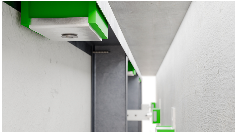 This acoustic head plate bracket helps decouple a partition head plate from the structure above.